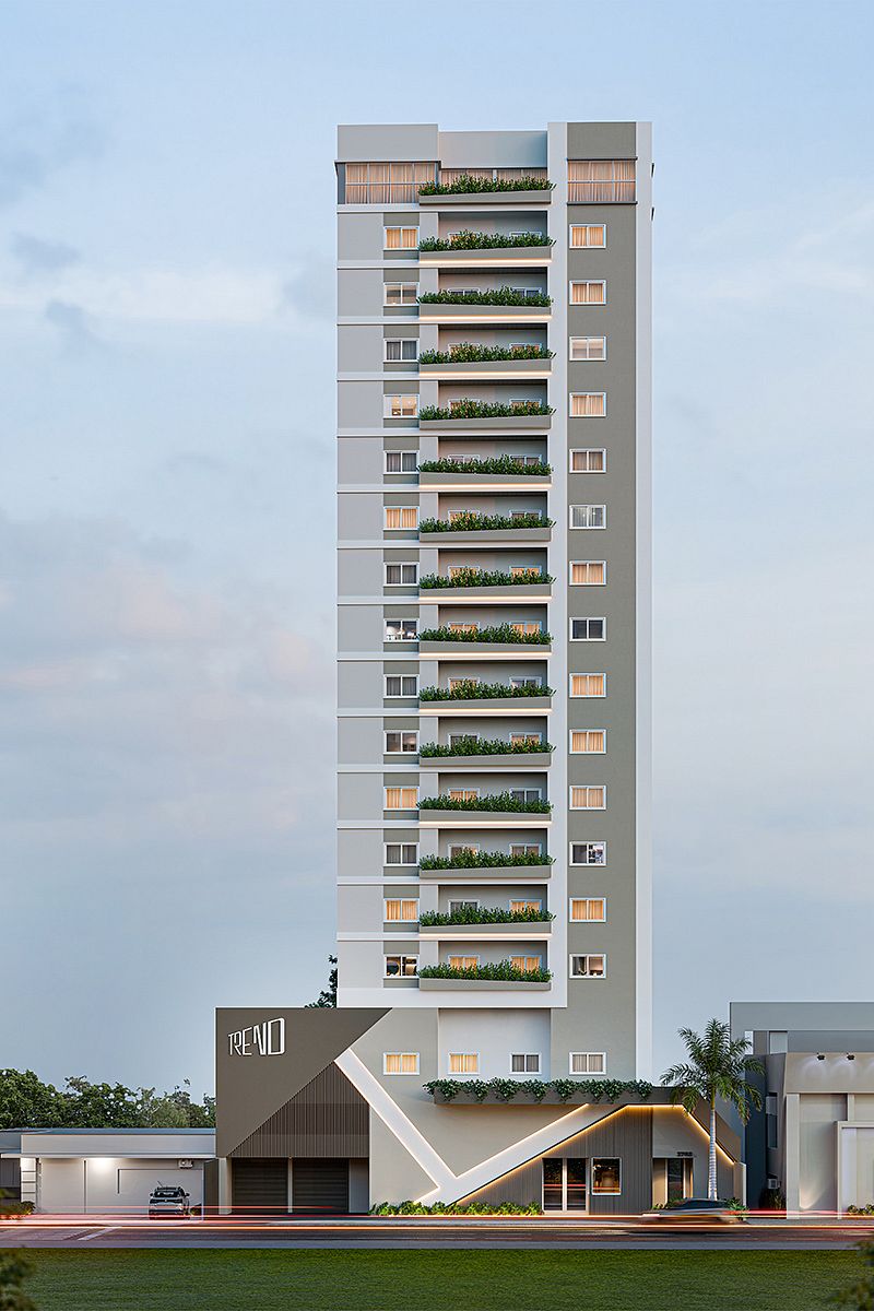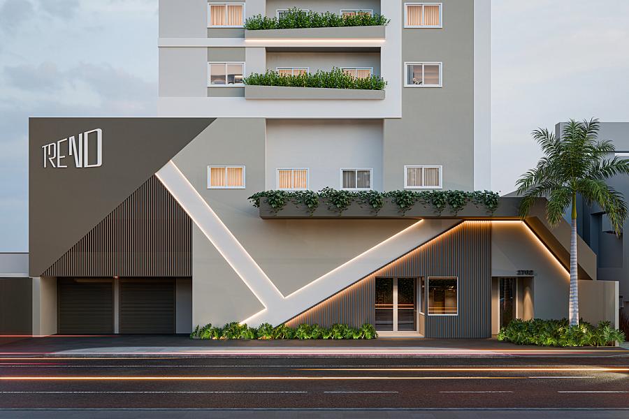 Aqui, o design arrojado e as linhas fluidas da arquitetura são o palco do seu novo ciclo de vida. A fachada, com suas linhas inclinadas e perspectiva crescente, replica o movimento e confere ritmo e vida ao prédio. O contraste de uma inclinação e uma declinação nas floreiras reforça que o TREND está sempre à frente, ditando a vanguarda.
