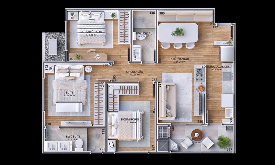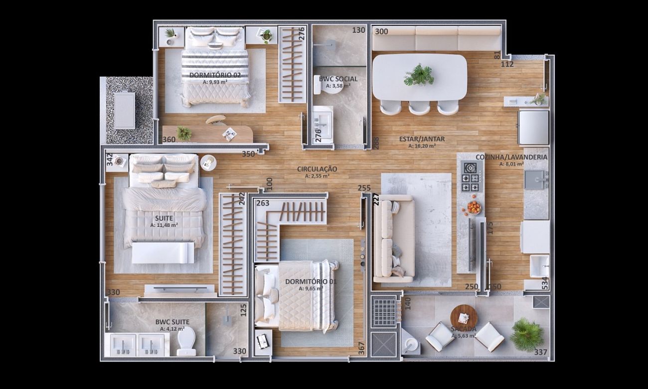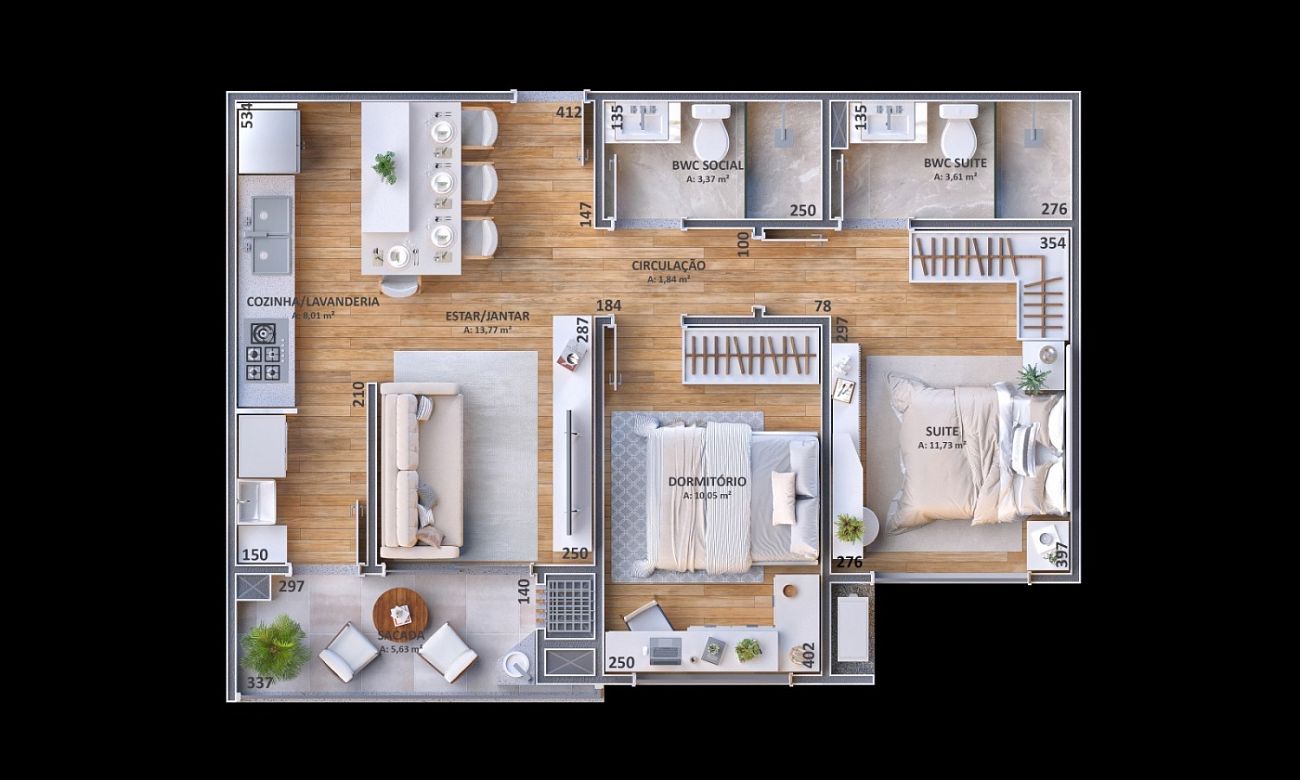 • Áreas Privativas: 65,91 m² ou 80,37 m²