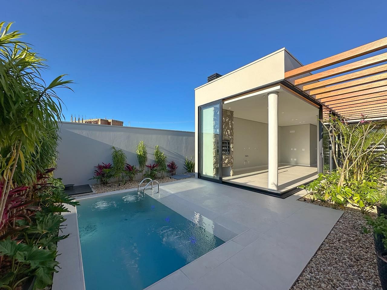 Piscina Aquecida com Hidromassagem: Tratamento com sal (mais saudável que cloro) e iluminação LED para momentos únicos