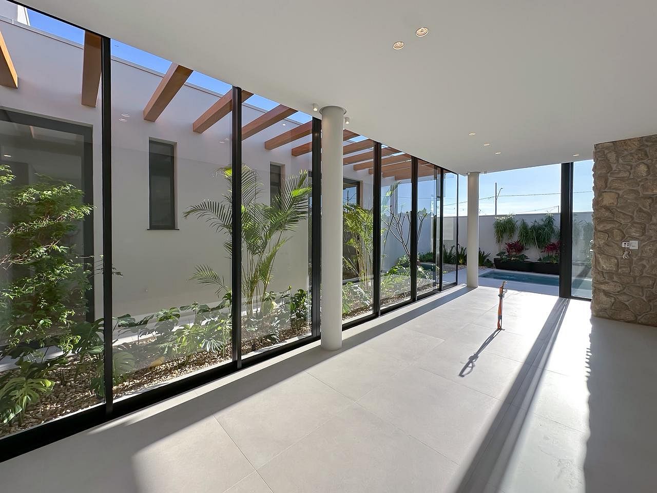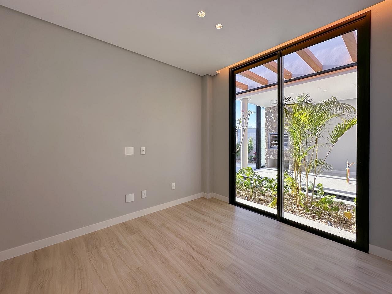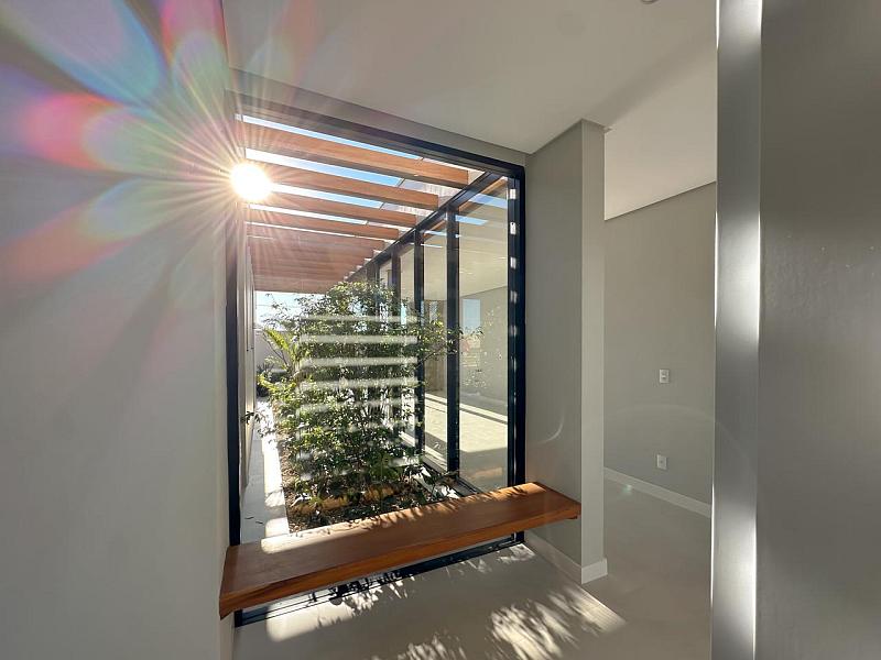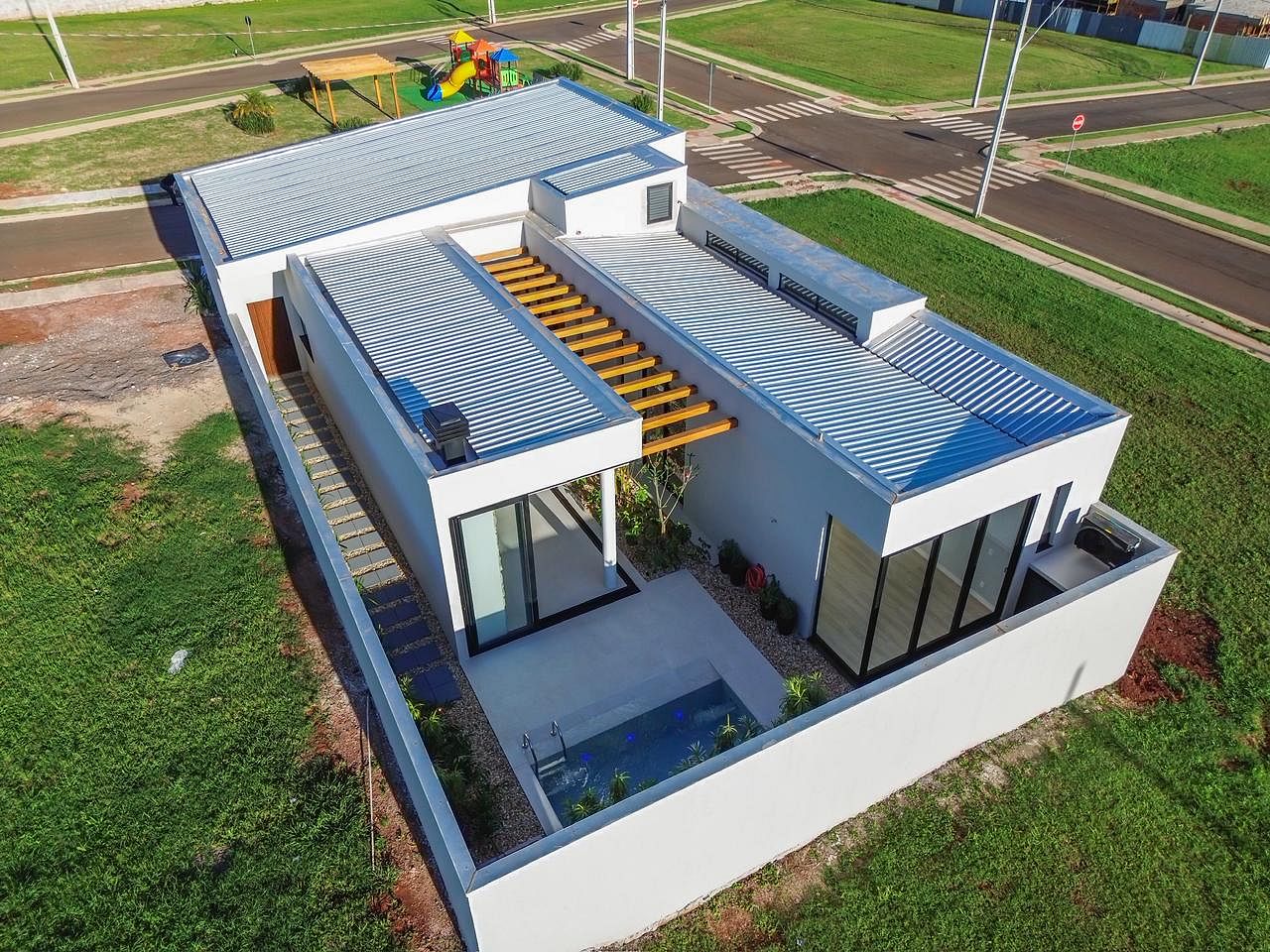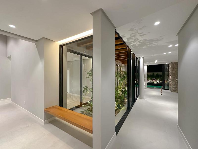 Jardim Central com Pergolado: O coração da casa, onde a luz natural e o verde se tornam parte da sua rotina diária