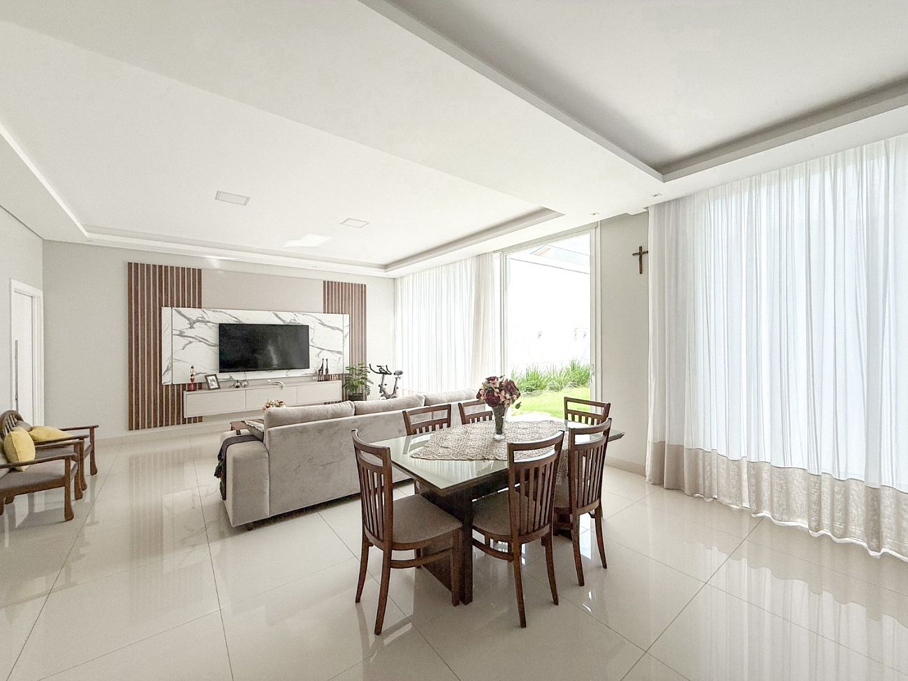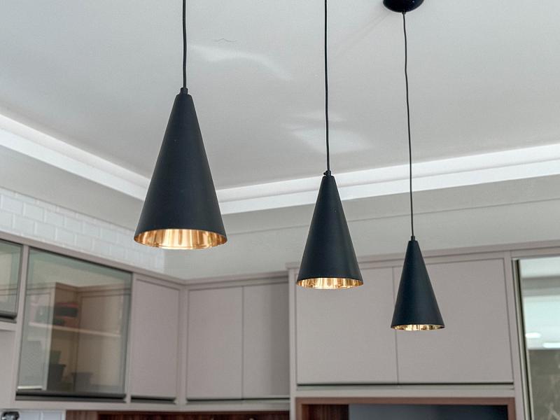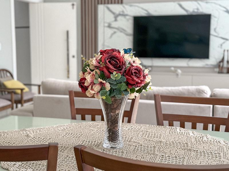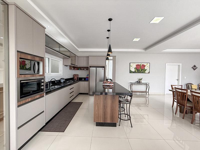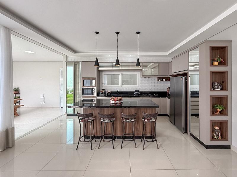 • Área Social Integrada: Conceito aberto unindo cozinha americana, sala de jantar e estar. O ambiente possui pé-direito elevado, rebaixo em gesso com projeto luminotécnico em LED e piso em porcelanato de 1ª linha.