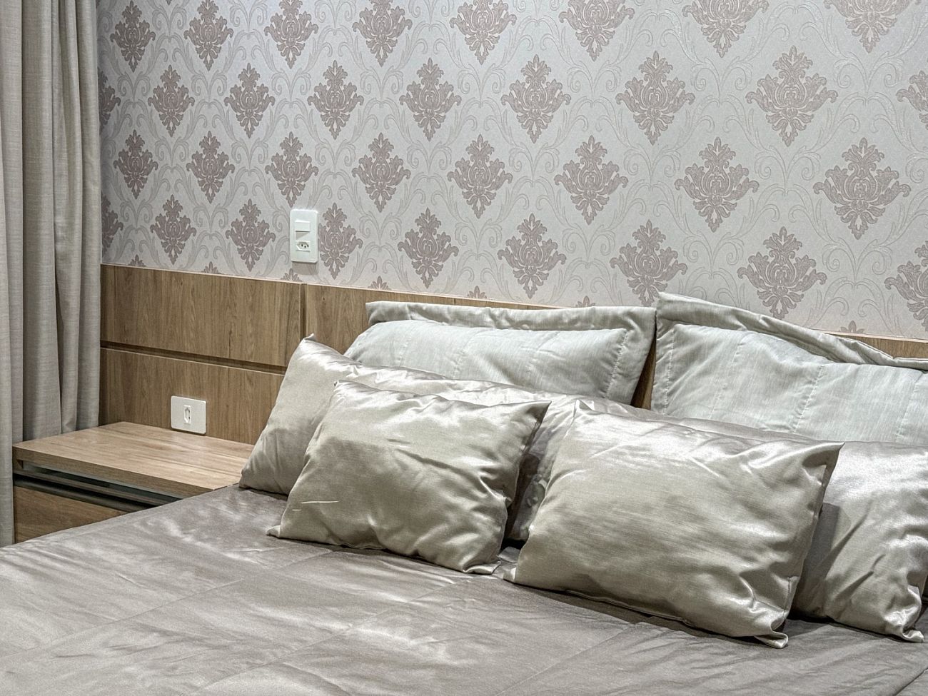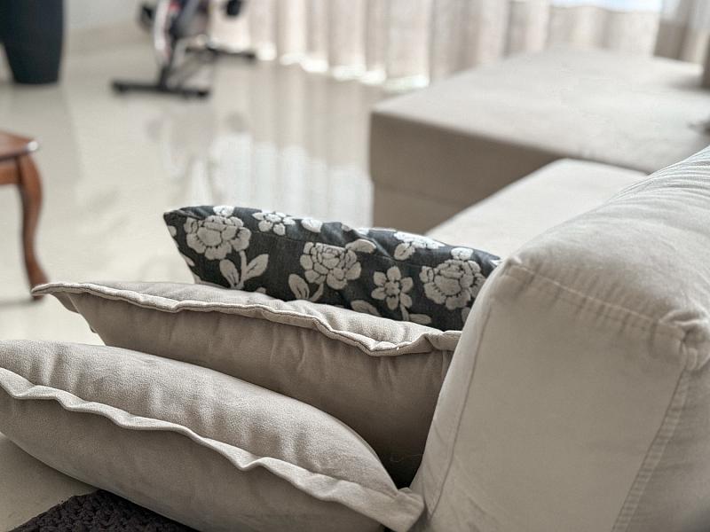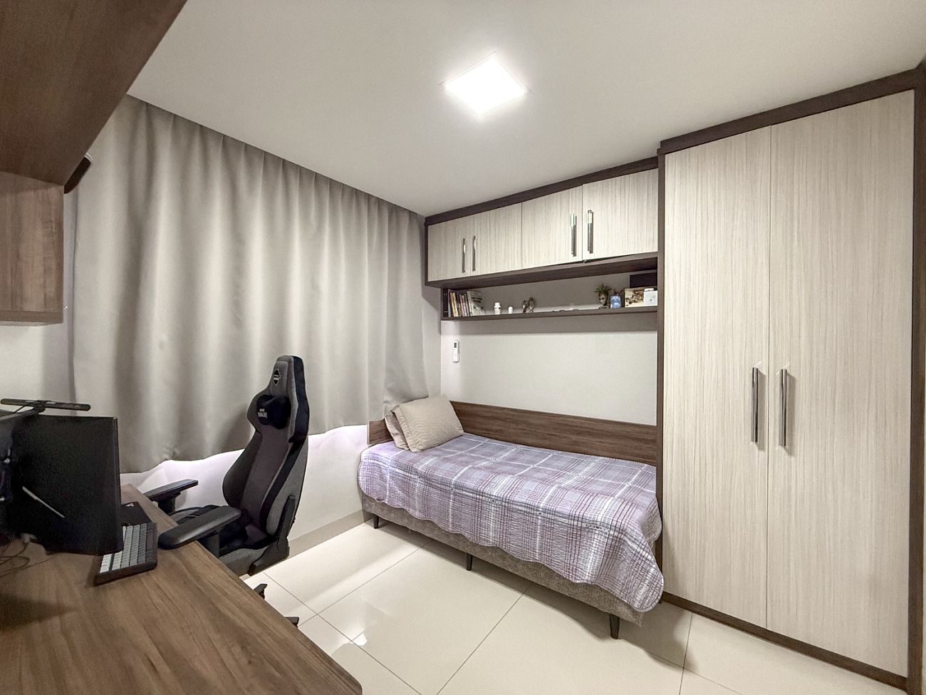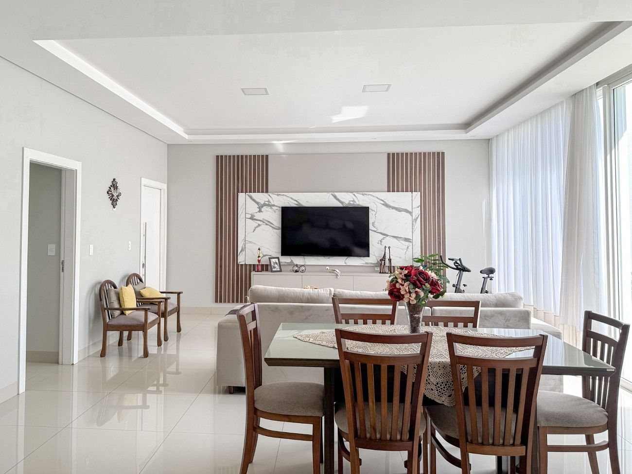 • Área Social Integrada: Conceito aberto unindo cozinha americana, sala de jantar e estar. O ambiente possui pé-direito elevado, rebaixo em gesso com projeto luminotécnico em LED e piso em porcelanato de 1ª linha.